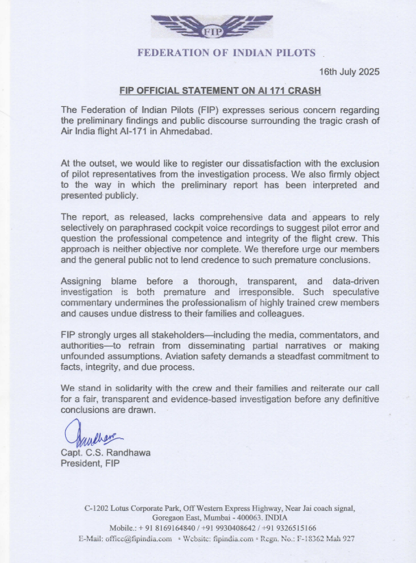 FIP ने घोषणा की कि वह AAIB और नागर विमानन मंत्रालय के साथ बैठक कर पूर्ण जांच रिपोर्ट की मांग करेगा। साथ ही, पायलटों के हितों की रक्षा के लिए कानूनी कार्रवाई का भी विकल्प खुला रखा गया है।