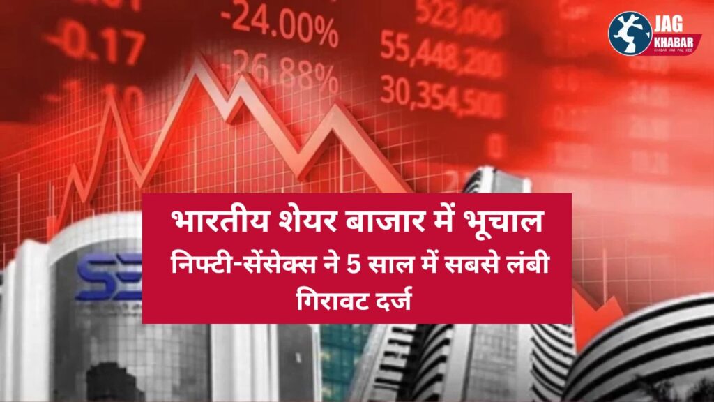 “6 हफ्ते लगातार लाल निशान! निफ्टी-सेंसेक्स पर मंडरा रहा है 5 साल का सबसे भारी संकट।”
