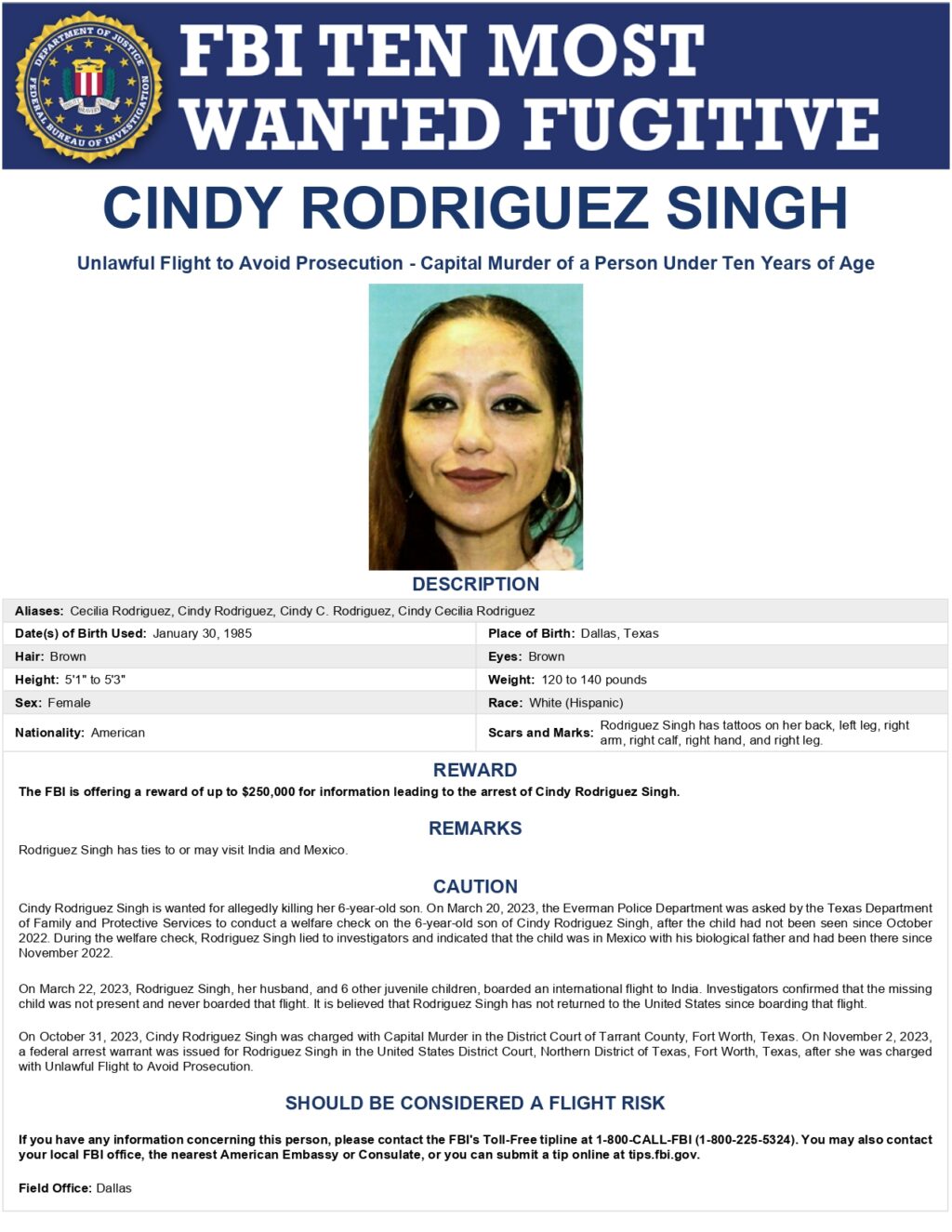 एफबीआई ने सिंडी रोड्रिगेज सिंह की गिरफ्तारी पर 250,000 डॉलर का इनाम रखा